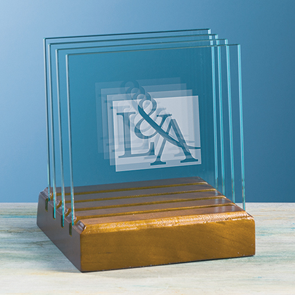 • jade glass • reverse-side etching • polished walnut base • set: 4.75"h x 4"w x 4"d, coaster: 4"sq • presented in a stylish gift box